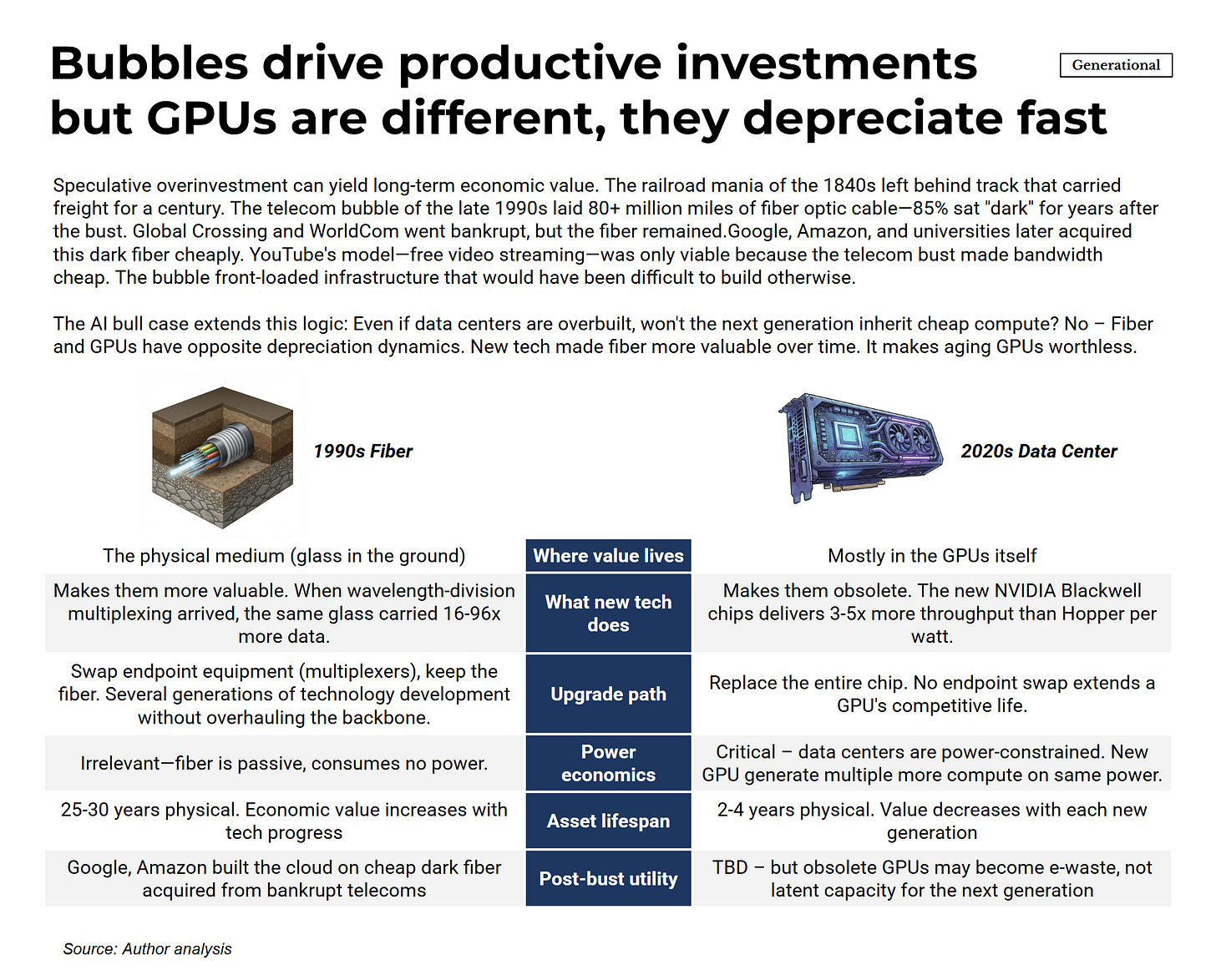 GPUs follow a different pattern. NVIDIA releases a new architecture roughly every 12-18 months, and each generation delivers 2-4x better performance per watt than its predecessor. Unlike fiber, where new technology makes existing infrastructure more valuable, new GPU technology makes existing chips obsolete. Operators must replace the GPUs themselves.