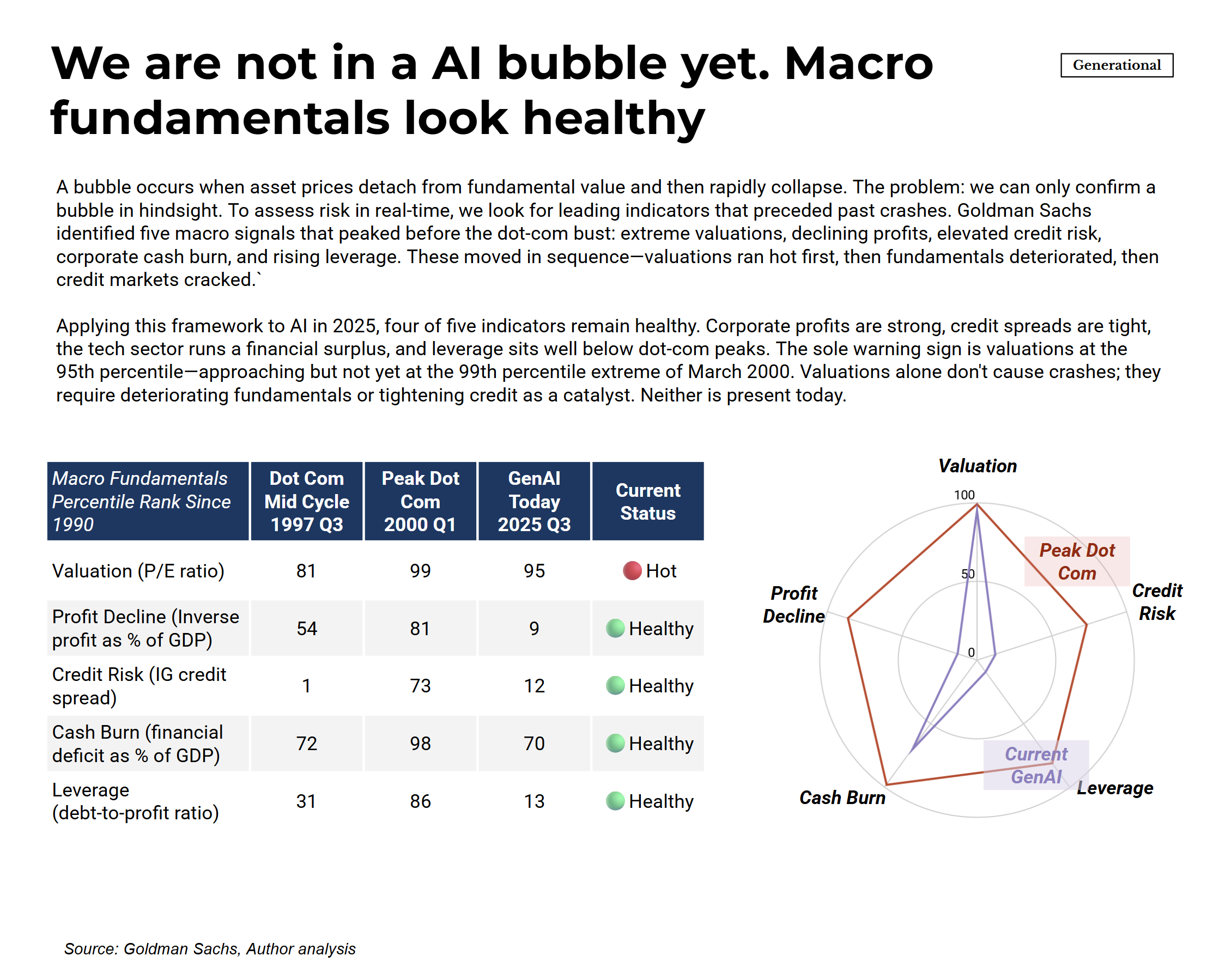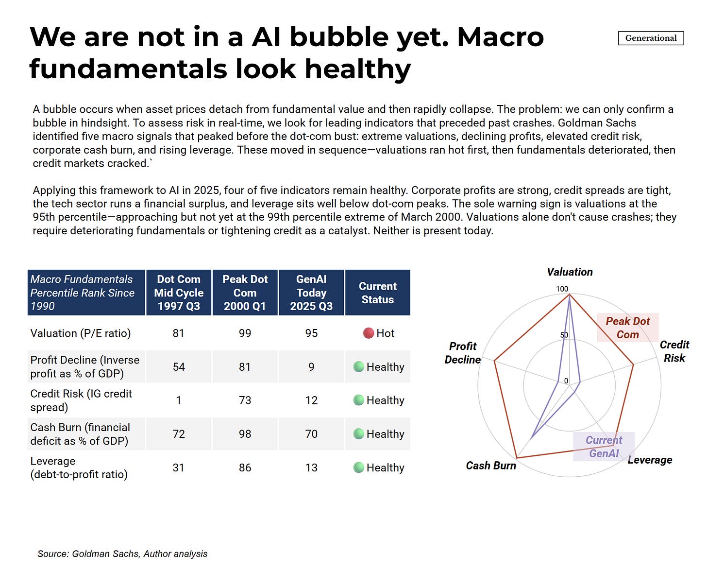 This framing helps explain why the traditional bubble indicators aren’t flashing red. Economists look at five macro signals that preceded the dot-com crash: extreme valuations, declining corporate profits, elevated credit risk, high cash burn, and rising leverage. These tend to move in sequence—valuations run hot first, then fundamentals deteriorate, then credit markets crack.