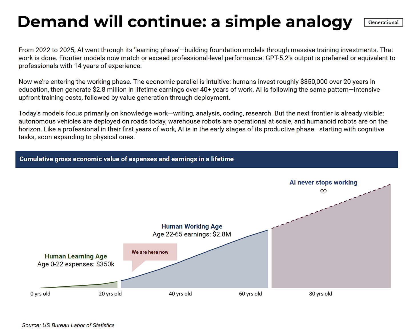 One way to contextualize where AI sits developmentally: think of it like human capital formation. Humans absorb roughly $350,000 in rearing and education costs over 20 years, then produce approximately $2.8 million in lifetime earnings over a 40+ year career. AI spent 2022-2025 in its equivalent “education phase”—massive investment in training foundation models. We’re now entering the “working phase” where deployment generates returns. The important difference: humans retire and their knowledge doesn’t transfer perfectly. AI systems can operate indefinitely and improve continuously.