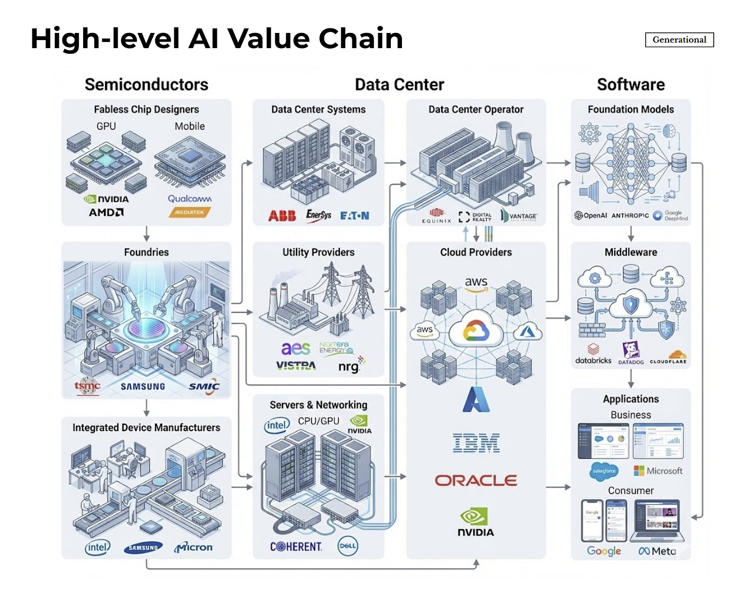 Meeting this demand requires building across the entire AI value chain—from semiconductor fabrication through data center infrastructure to the software layers that deliver AI to end users.