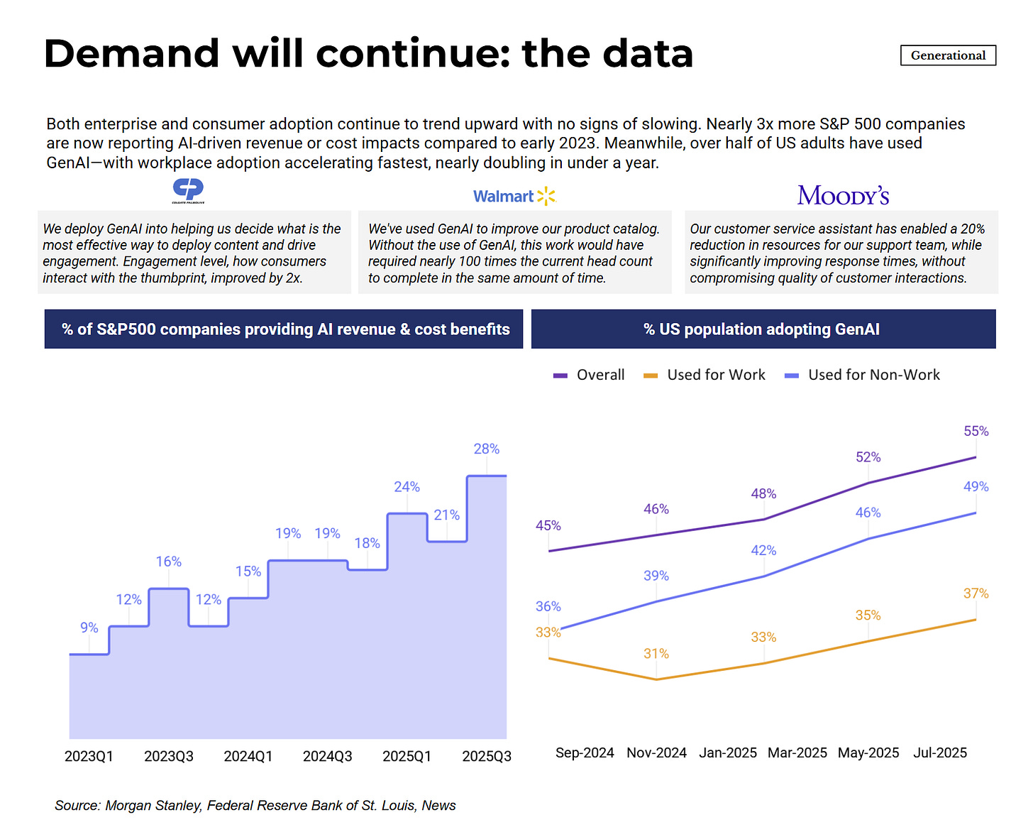 Consumer adoption data reinforces this. Over half of US adults have used GenAI, with workplace usage nearly doubling within a year. At 900+ million weekly active users, ChatGPT alone has reached a scale where “will people use this?” is no longer a relevant question.