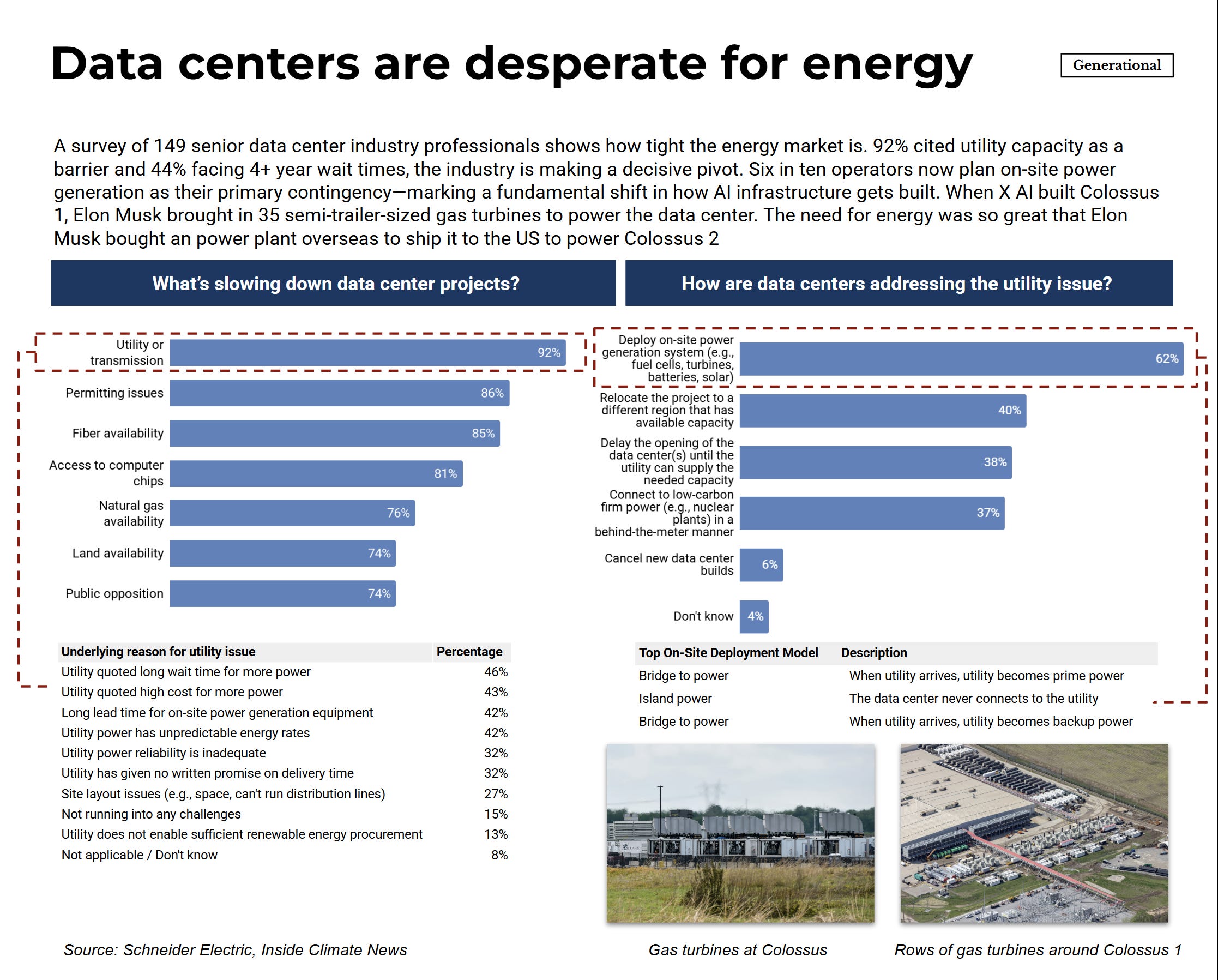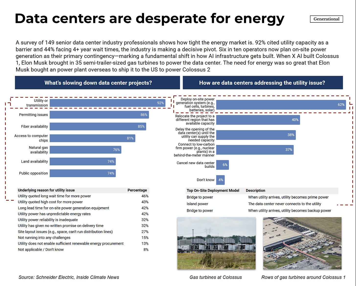 The industry response has been to route around constraints rather than wait for them to clear. 62% now plan on-site power generation as primary contingency—a shift from treating utilities as default to treating them as backup. When Elon Musk built Colossus 1, he brought in 35 semi-trailer-sized gas turbines. For Colossus 2, he bought a power plant overseas, disassembled it, and shipped it to the US for reassembly. These reflect how tight the energy market has become.