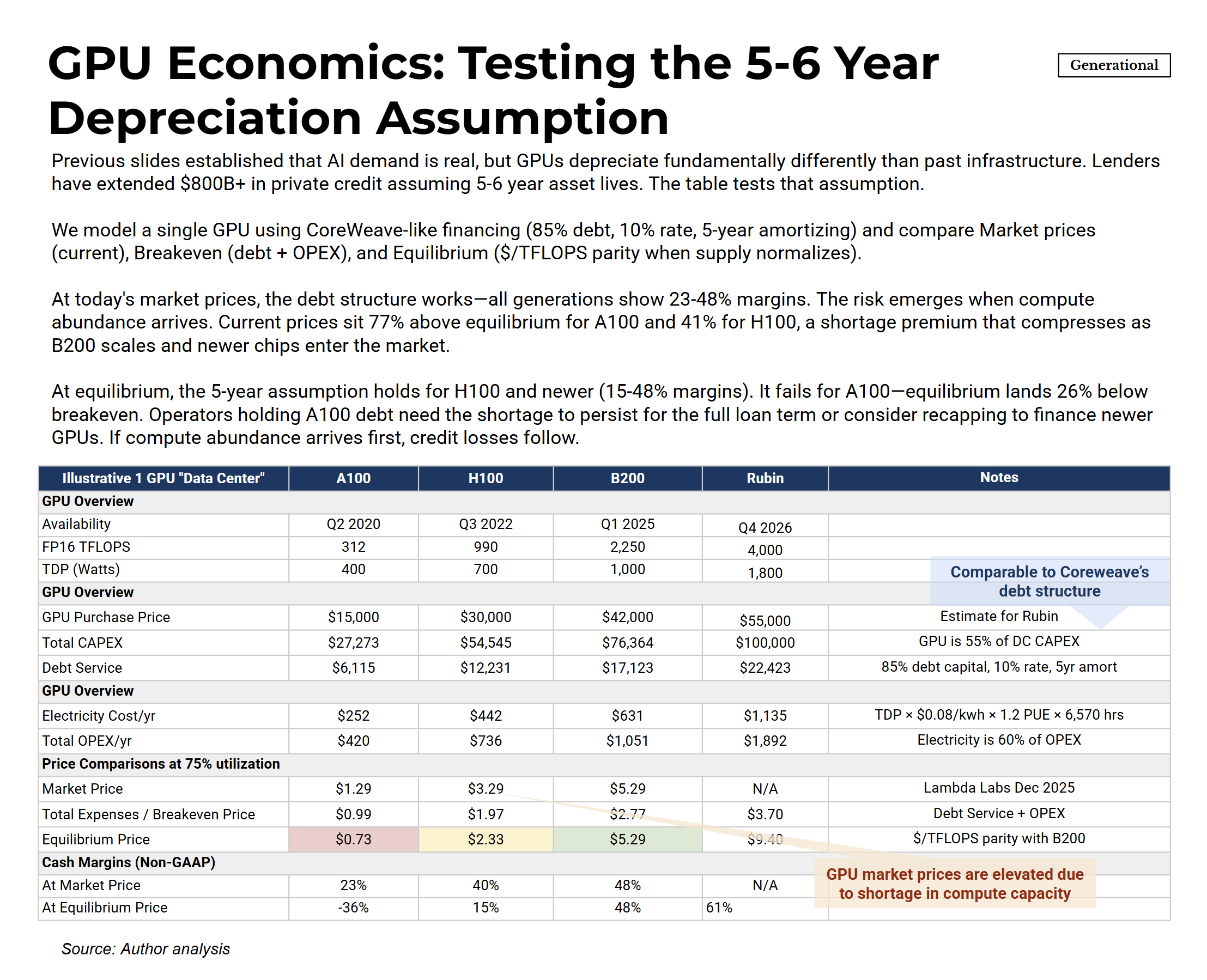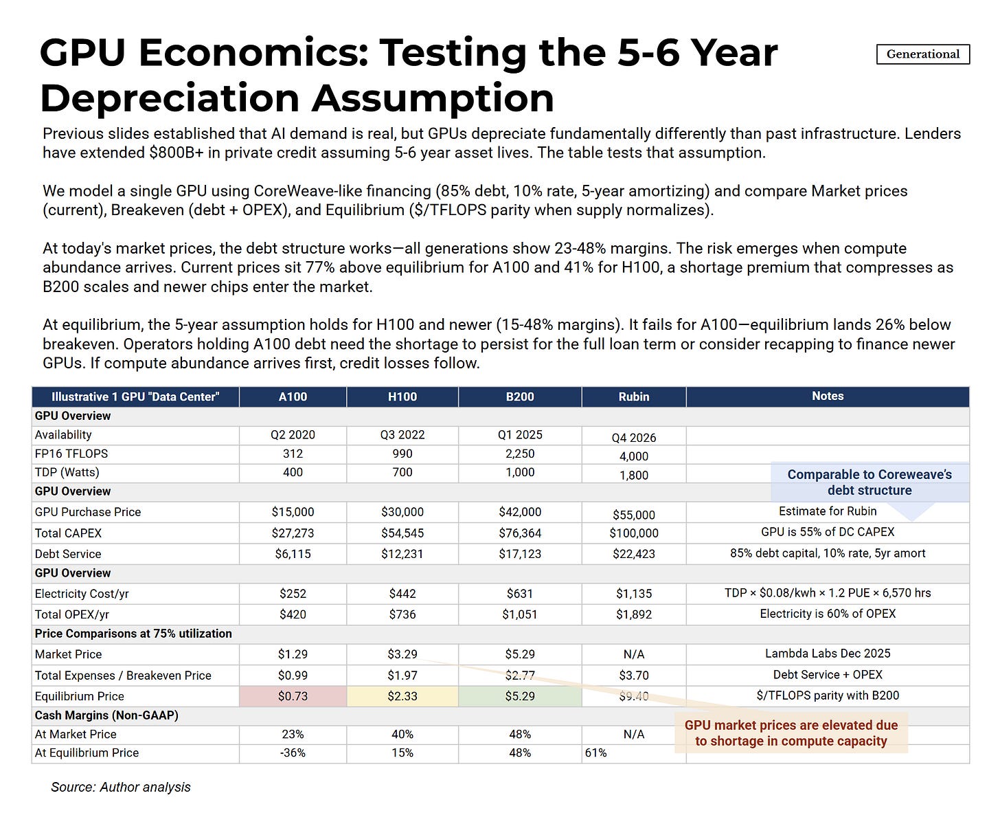 At today’s market prices, all GPU generations show healthy margins. This shortage premium is what makes the leveraged financing structure work.