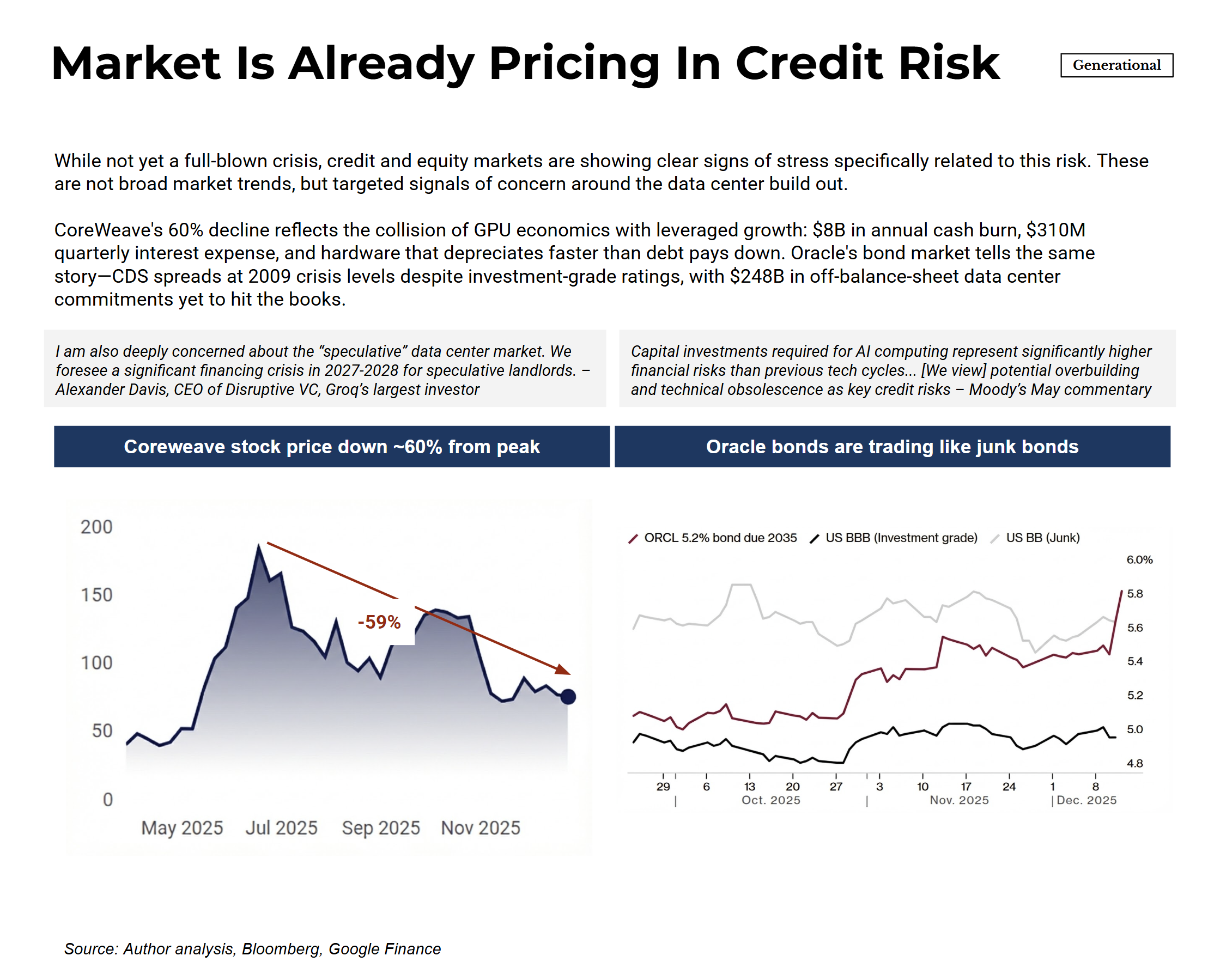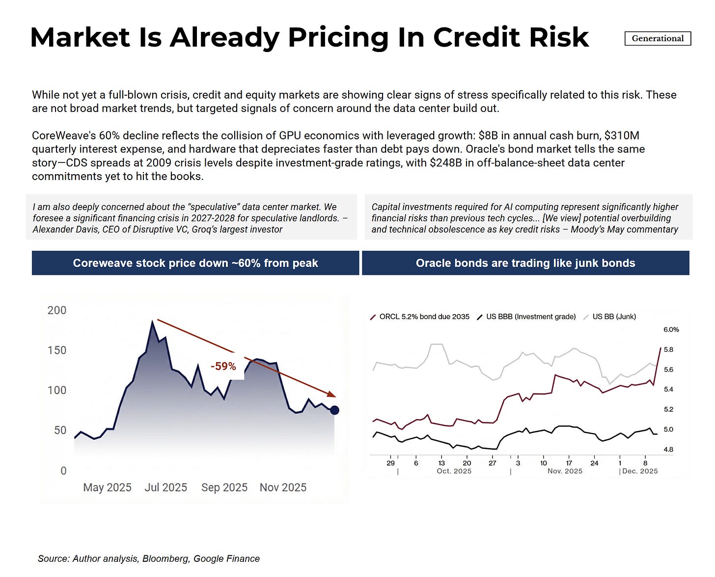 If the risk materializes, the result wouldn’t look like a market-wide crash. It would look like credit impairments concentrated in GPU-backed lending, distress among leveraged data center operators, and margin compression for providers running older hardware. The stress would likely surface in credit markets first—in private loan defaults, securitized asset writedowns, and distressed refinancings—before rippling into equity markets as the hyperscalers eventually take the writedowns. This isn’t a prediction that stock prices won’t fall. It’s a view on sequencing: credit cracks first, equity follows. CoreWeave’s stock and Oracle’s bonds suggest markets are beginning to price this scenario.