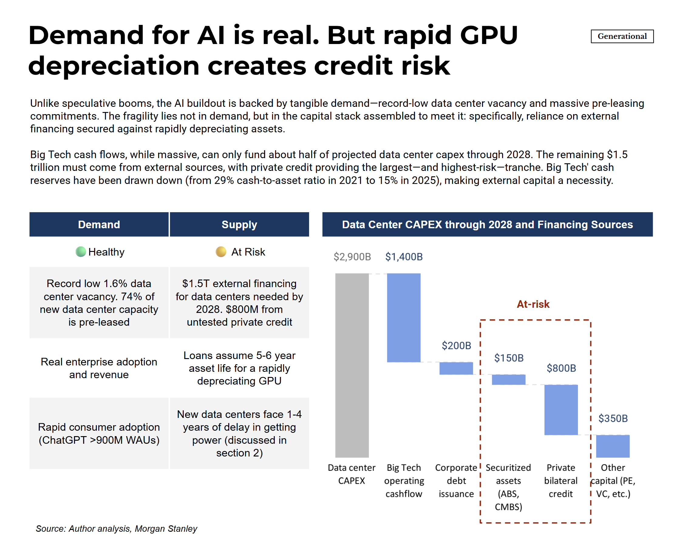 Credit risk. This is where our analyses converge most directly. In “Unicorns and Cockroaches,” Burry writes: “The big target for private credit now is AI data centers... there is a duration mismatch of catastrophic proportions between the asset and the loan.” In his Q&A piece, he adds: “There is a lot of leverage behind the data center buildout, and I believe bank and non-bank entities will be at risk if that buildout busts.”