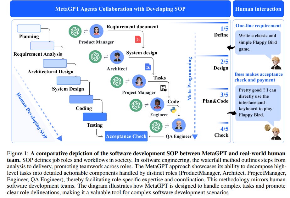 That future just got closer. In the past month, there has been the advent of practical multi-agent projects. MetaGPT is the most popular one so far because it is open-source, achieved state-of-the-art (SOTA) performance, and provides an intuitive framework to build a team of AI agents.