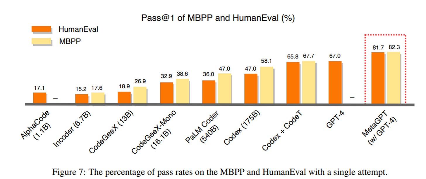 In the paper, the creators of MetaGPT configured it to be a software development team composed of a product manager, systems architect, program manager, software engineer, and a QA engineer. To have an objective measure of the AI team’s performance, they tested against two popular coding benchmarks, HumanEval and MBPP, and achieved SOTA results. LLMs that perform well on both benchmarks are considered to be more capable of generating code that is both correct and readable.